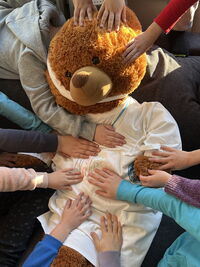 Freitags lernen die Kinder der Klassenstufen 1 und 2 mit Teddy Tollpatsch zusammen Grundlagen der Ersten Hilfe. Montags und donnerstags lernen die Kinder der 3. und 4. Klassenstufe. Alle Kinder sind sehr motiviert dabei.